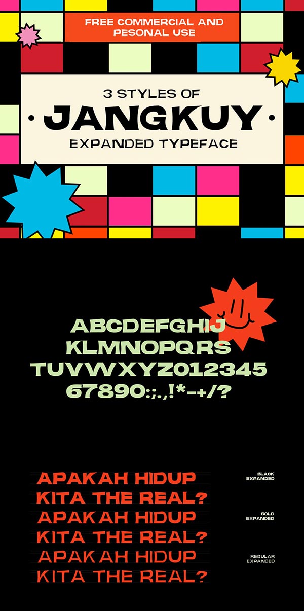 JANGKUY是Azkia,Fadhlan创作的一款免费英文字体,拥有3个字重。JANGKUY字形稳重却不失灵动,底部笔画对齐, 高度相对常规的英文字体更扁更矮,低沉有力。作者声明个人及商用免费,免费商用字体