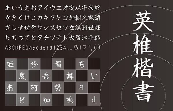 英椎楷书,英椎楷书共收录了6879个文字,因为日文字符一般是以JIS水准为标准,所以虽然是日文字体,但是中文繁体 支持得还是比较完整的。而简体中文则相对较少,作者已经公开声明这款字体可以免费商用,免费商用字体