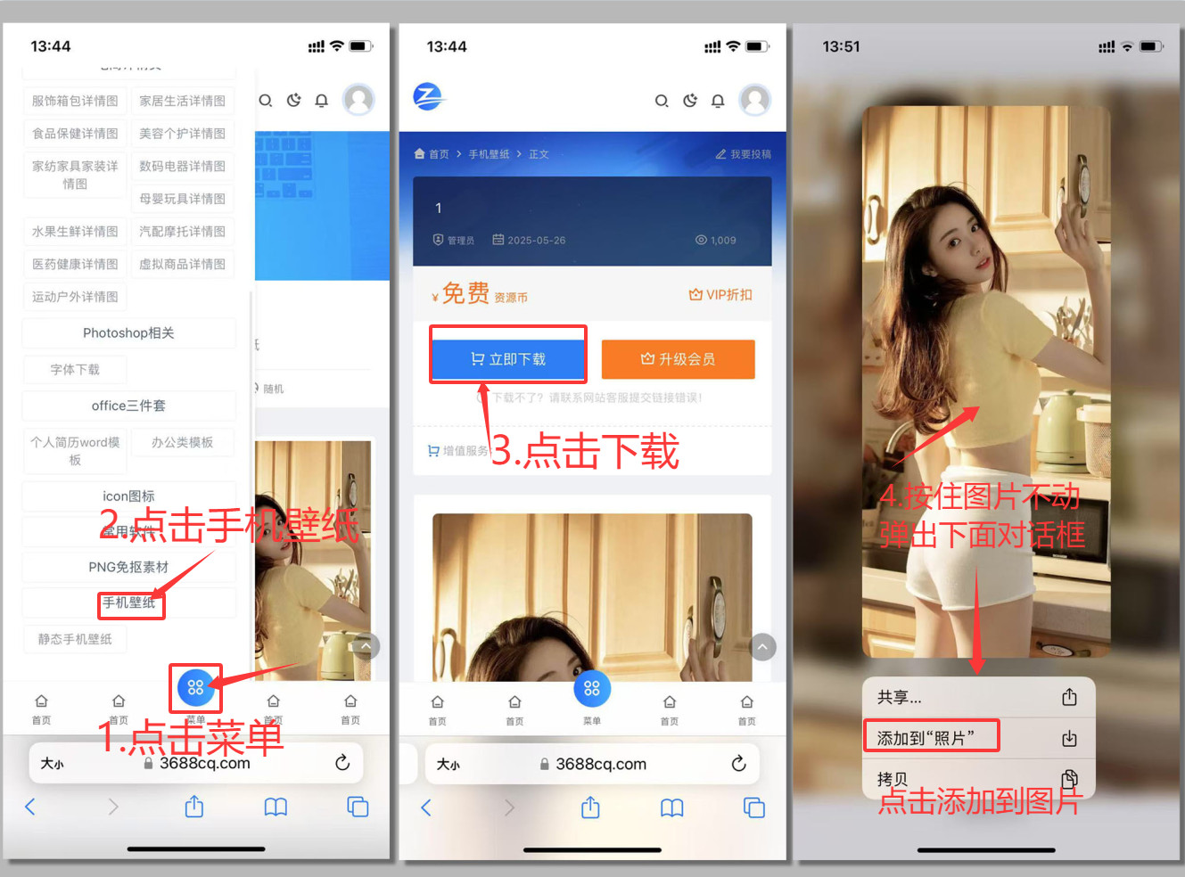 1,PC端直接在网站下载到电脑然后通过微信,QQ等软件传输到手机,保存下即可(应该地球人都会操作)。