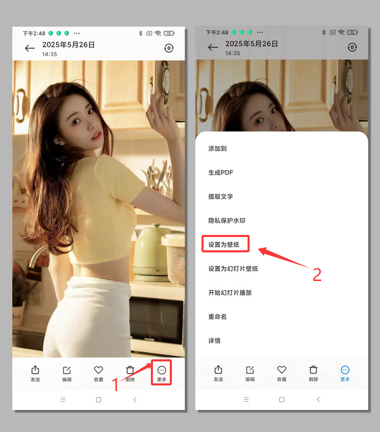 保存到手机以后,设置墙纸,这里以小米手机为例,打开保存的图片,点击右下角更多,然后"设置成壁纸"如下图: